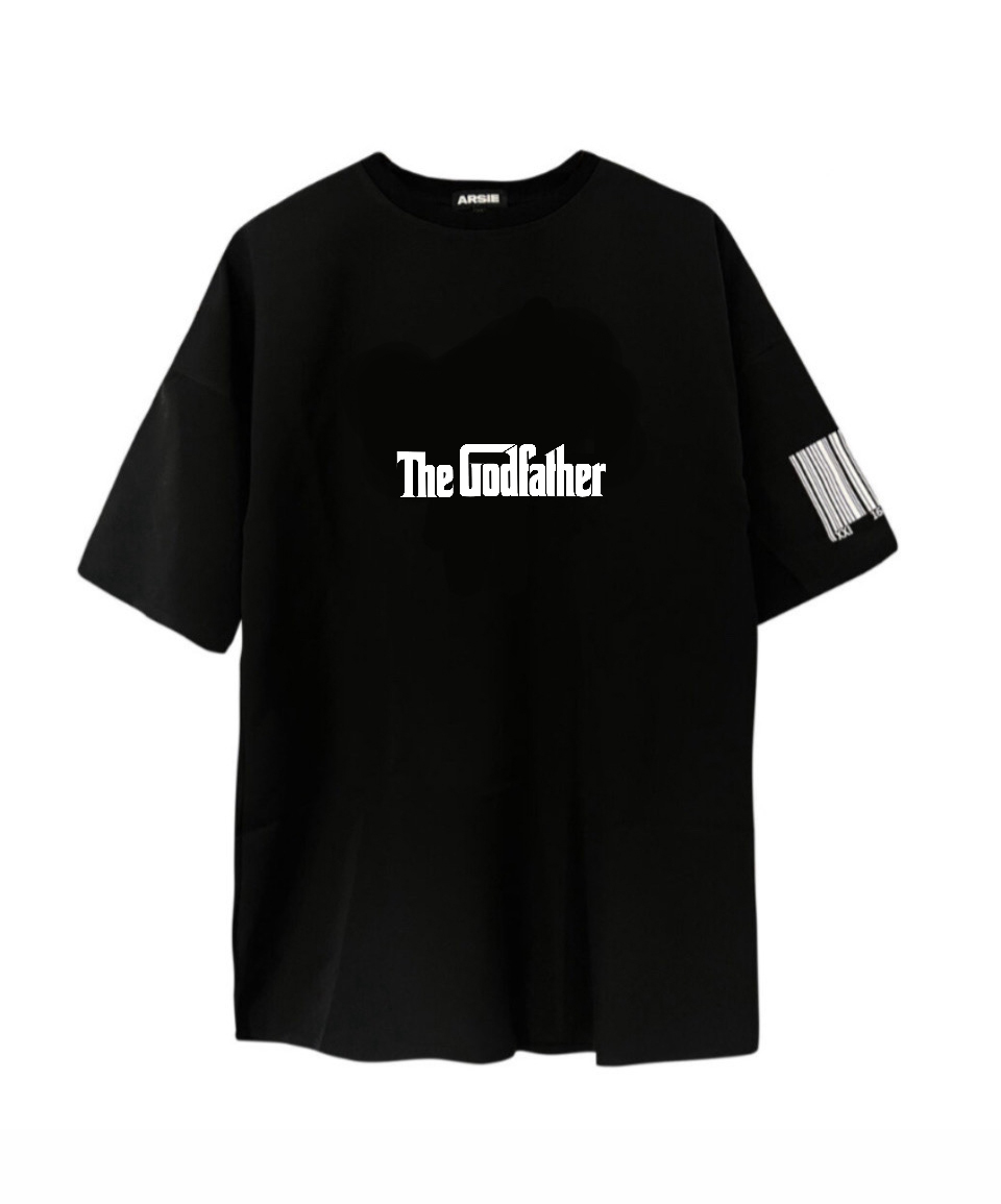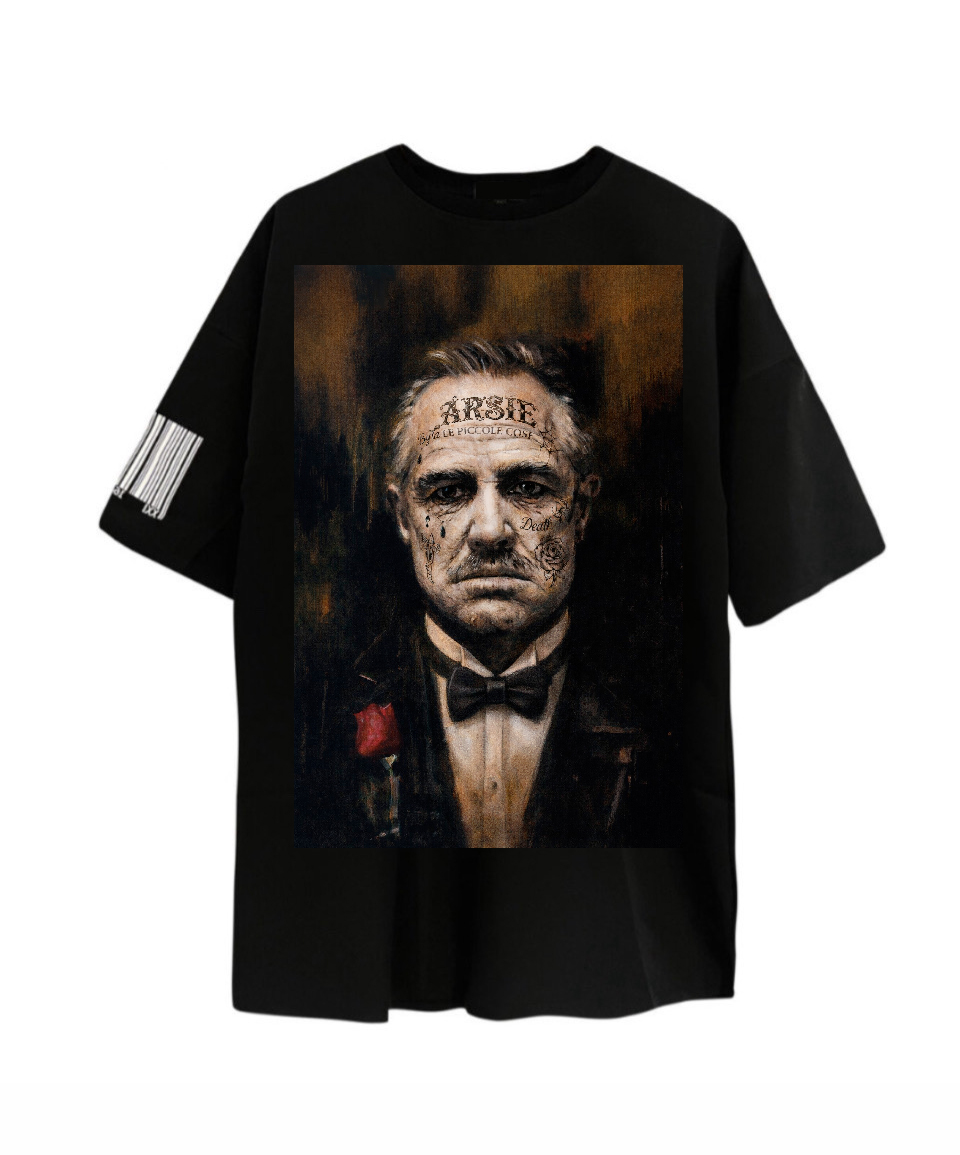 Camiseta hecha a mano oversize negro . Tejido bielastico con tematica El Padrino.