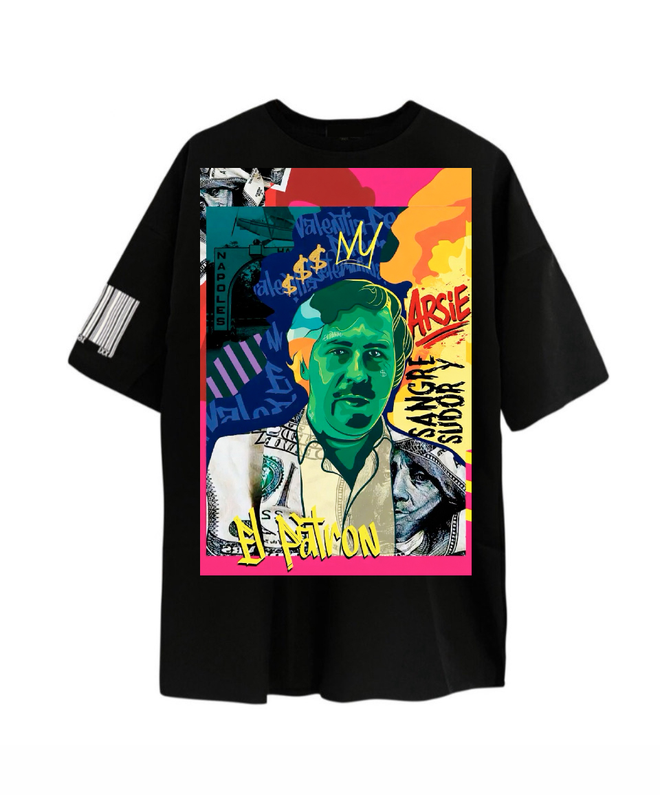 Camiseta bielastico negro oversize hecha a mano con temática El Patrón.