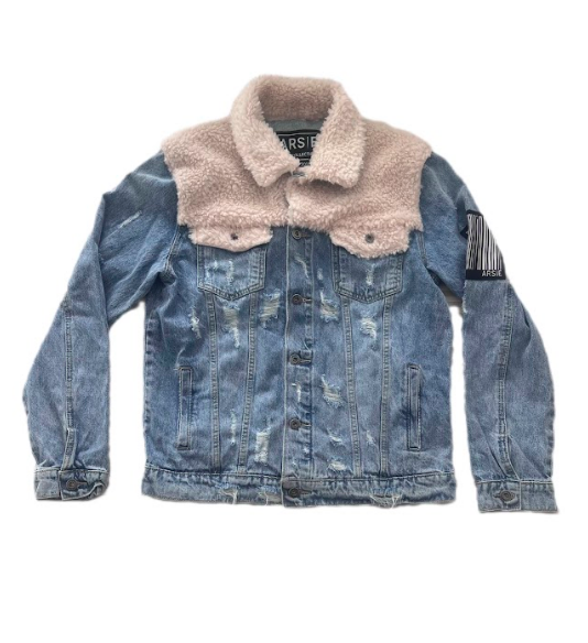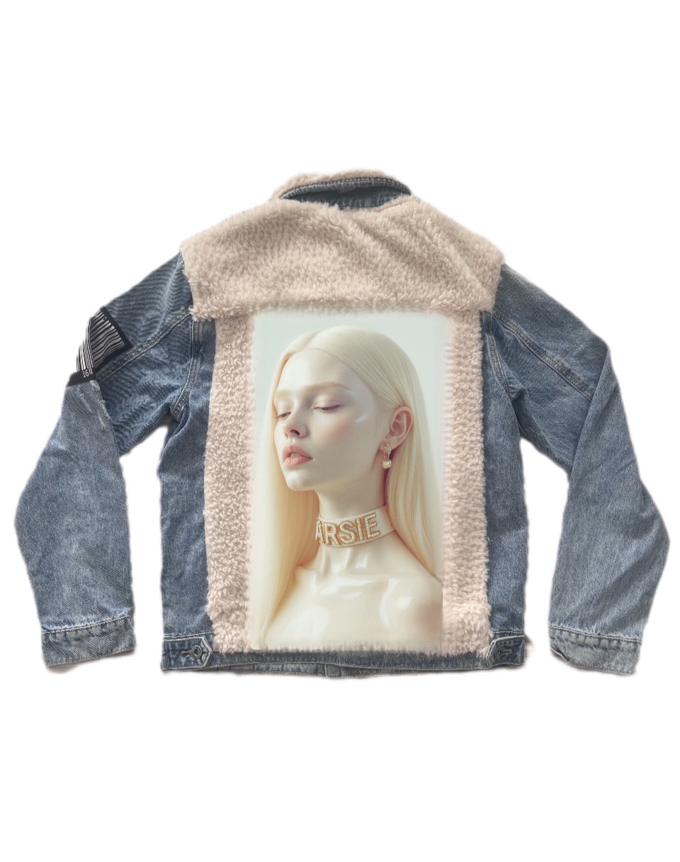 Chaqueta denim clarita con detalles de tejido de borrego e imagen preparada para la marca.