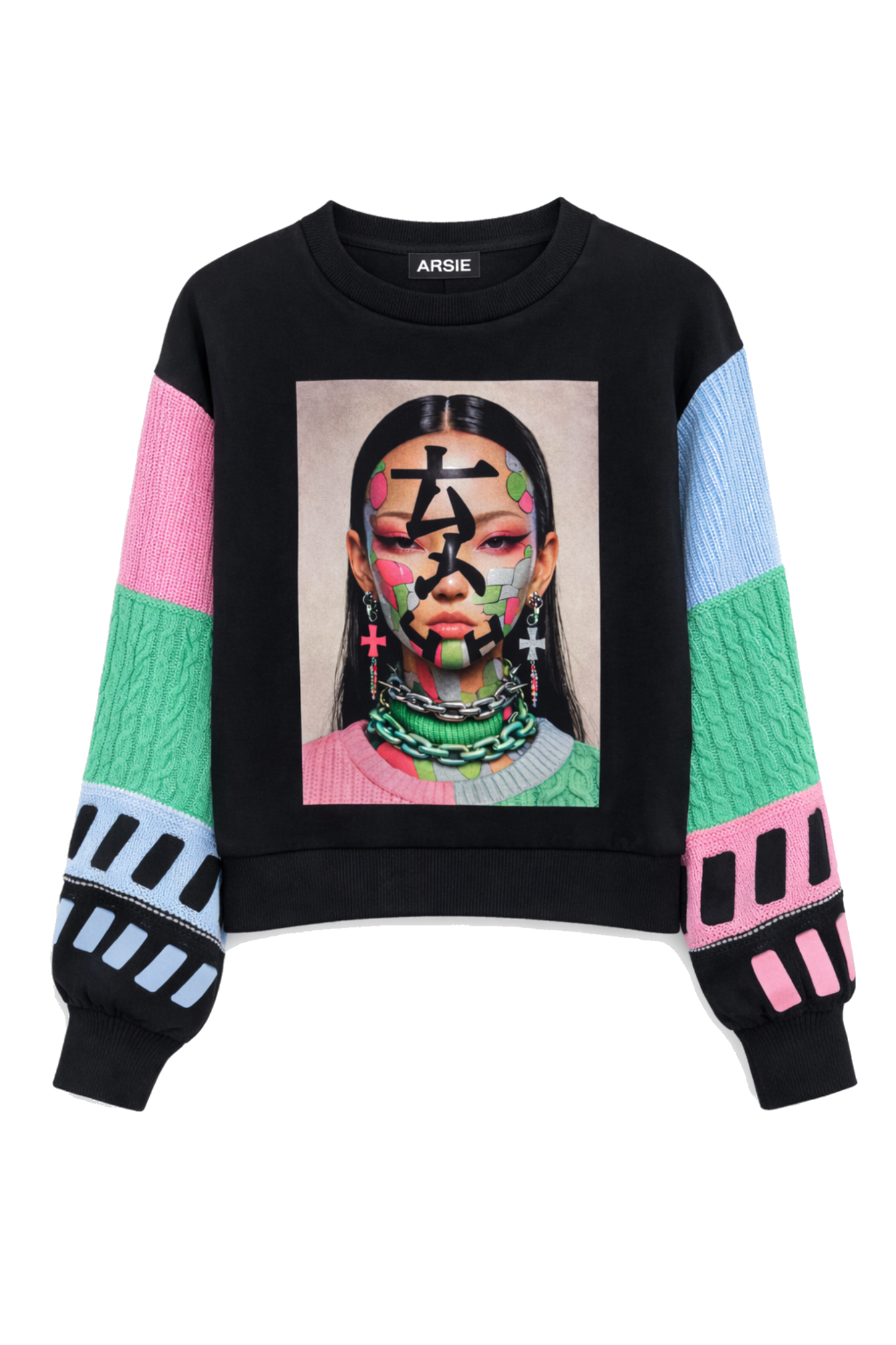 Sudadera base poliéster negro perchada en su interior con mangas de tricot multicolor. Imagen preparada para la marca de japonesa con los mismos tonos que las mangas.
